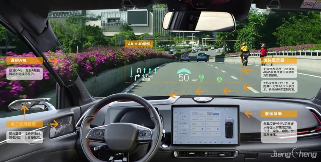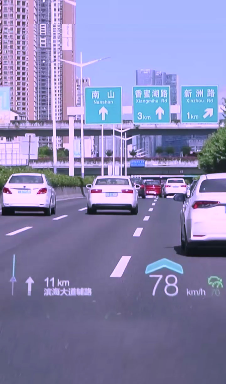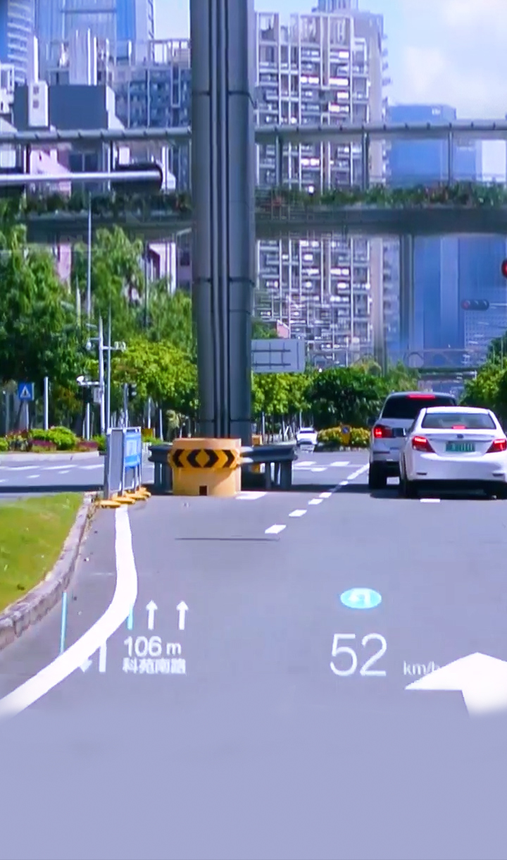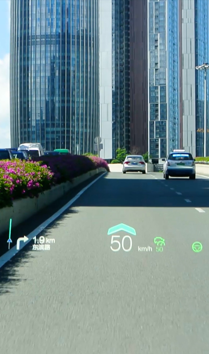 基于復雜變量環(huán)境完成大尺寸、小體積的光機設(shè)計,并采用多數(shù)據(jù)融合算法實現(xiàn)導航、ADAS等輔助駕駛信息在真實路況上的疊加、融合顯示,提升駕駛安全性的同時給予更酷炫、更智能的駕駛體驗。