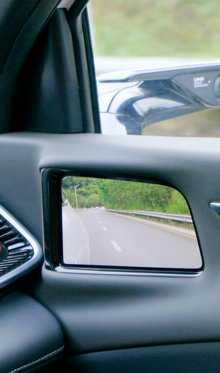 車規(guī)級OLED柔性屏貼合A柱設(shè)計,通過算法實現(xiàn)A柱“透明化、可視化”,不影響造型美觀與A柱強度情況下,完美解決A柱盲區(qū)問題。